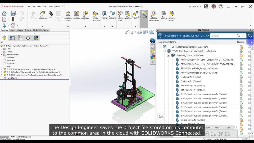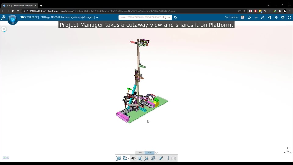 Project Manager views the FRC robot assembly with 3D Play. He gets his section view and the shares it on the Platform. |