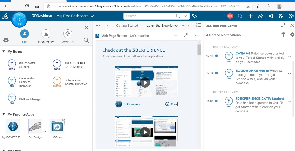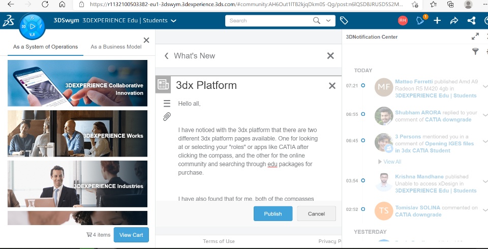 I have noticed with the 3dx platform that there are two different 3dx platform pages available. One for looking at or selecting your "roles" or apps like CATIA after clicking the compass, and the other for the online community and searching through edu packages for purchase. Both have different notifications and functions when clicking the compass or notifications, along with a few other different functions available. I have attached screenshots of both pages for reference.
