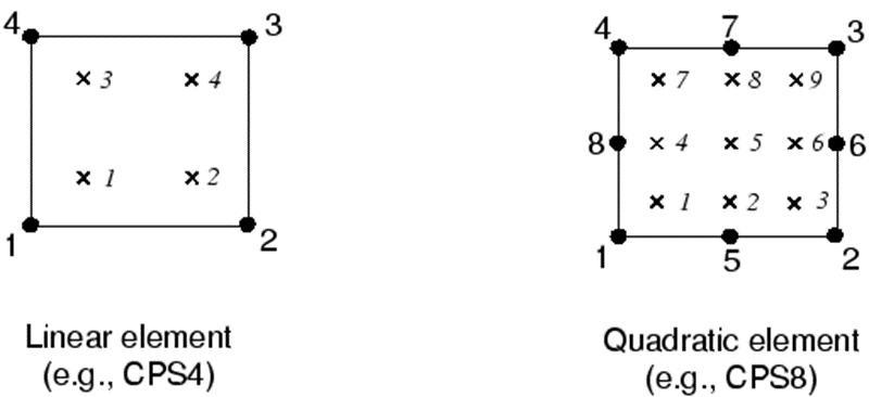 The expression “full integration” refers to the number of Gauss points required to integrate the polynomial terms in an element's stiffness matrix exactly when the element has a regular shape. For hexahedral and quadrilateral elements a “regular shape” means that the edges are straight and meet at right angles and that any edge nodes are at the midpoint of the edge. Fully integrated, linear elements use two integration points in each direction. Thus, the three-dimensional element C3D8 uses a 2 × 2 × 2 array of integration points in the element. Fully integrated, quadratic elements (available only in Abaqus/Standard) use three integration points in each direction. The locations of the integration points in fully integrated, two-dimensional, quadrilateral elements are shown in Figure 2.