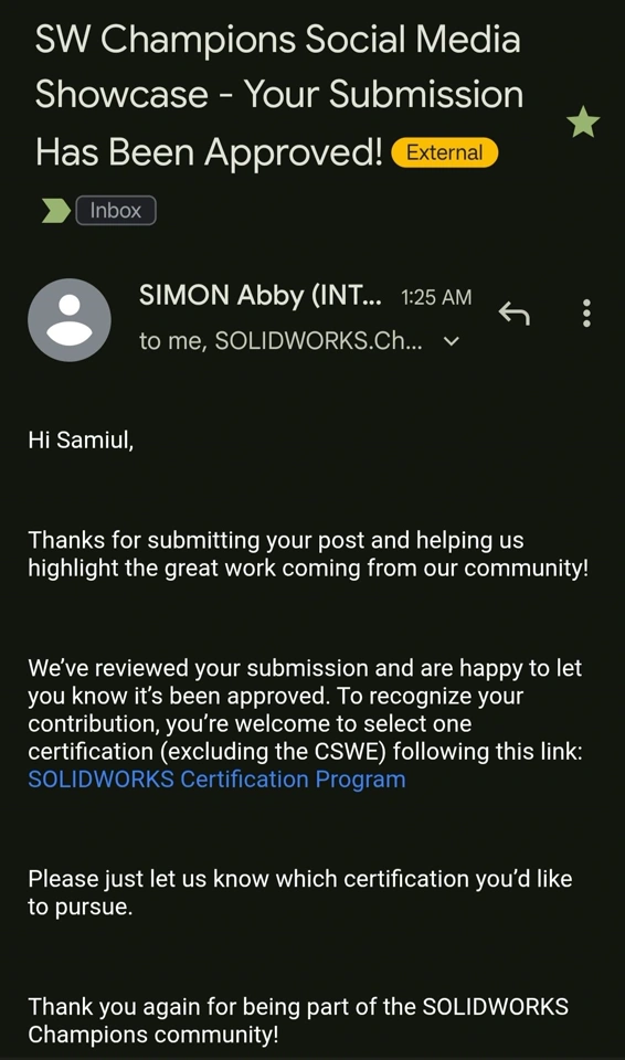 🌟 Excited to share that my submission to the SOLIDWORKS Champions Social Media Showcase has officially been approved!