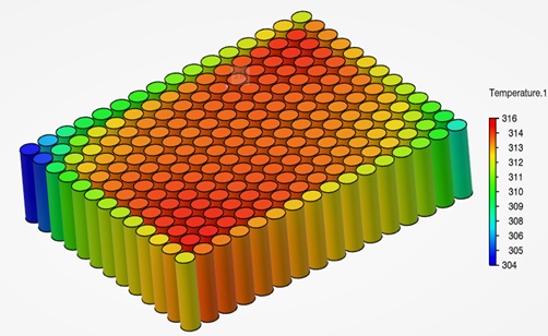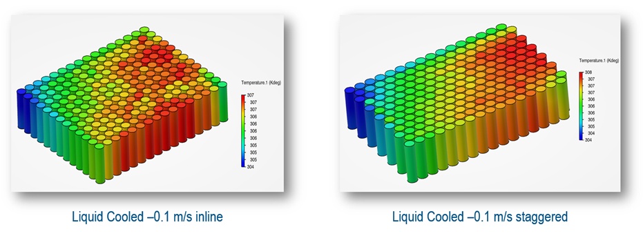 The main motto behind the simulation was to select the arrangement for cells and placement of inlet and outlet to achieve uniform and maximum cooling. The staggered arrangement and the linear cells arrangement was simulated, wherein the staggered arrangement was more effective but for ease of manufacturability the linear cell arrangement has been selected.
