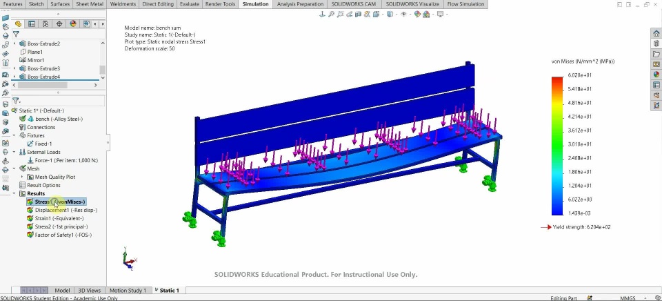 I make the design of bench in solid works. I begin the study in solid works simulation by some steps