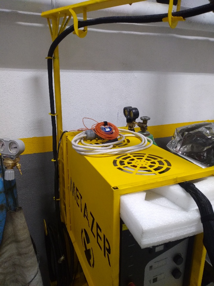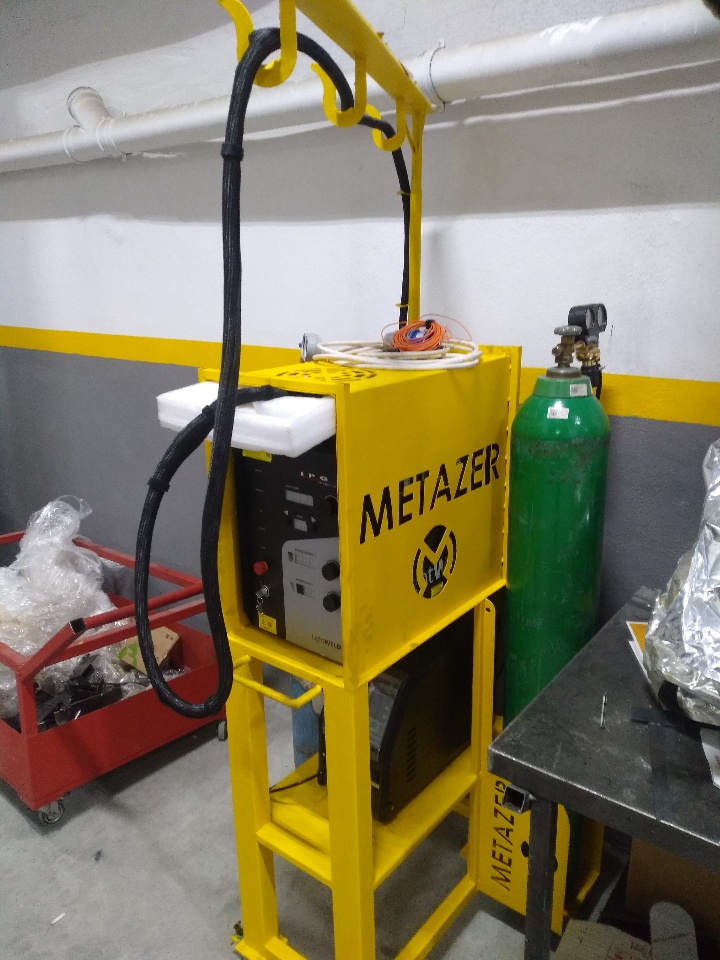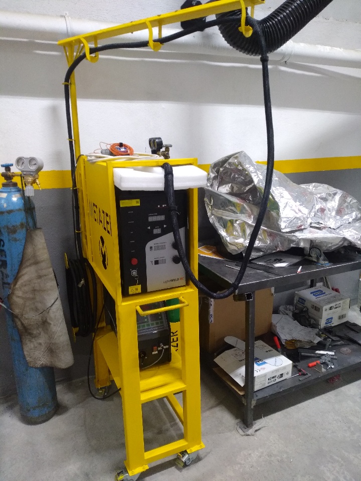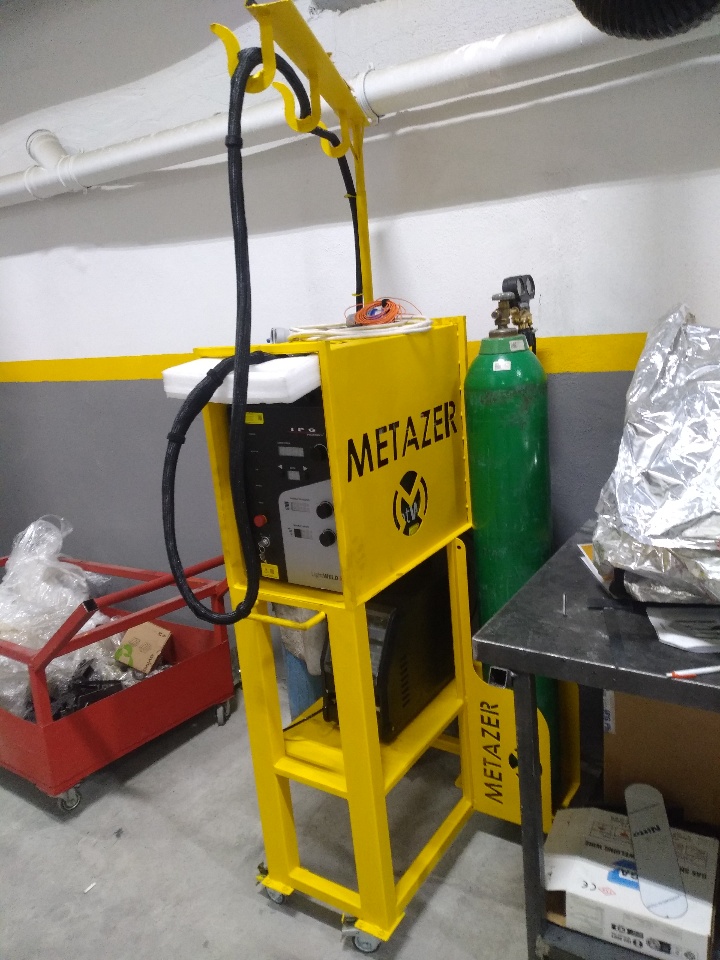I have designed a specialized portable desk for our workshop's new laser welding machine. This desk is built to accommodate the laser welding machine, the wire feed unit, and the gas cylinder. Additionally, I have integrated a 360-degree rotating crane system. This crane system is designed to prevent the fiber optic cable from falling to the ground and getting damaged.