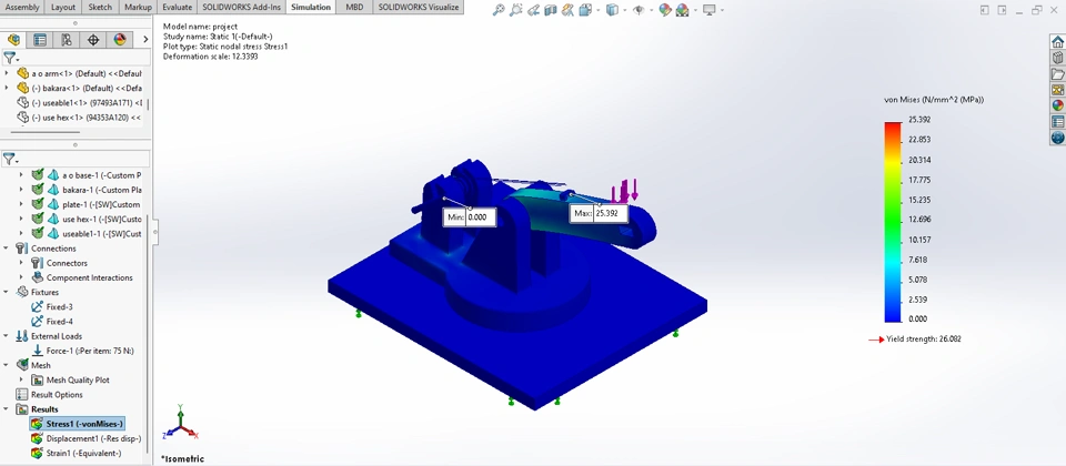 Using SolidWorks, I meticulously designed and simulated each part. I incorporated Design for Assembly (DFA) principles to simplify the assembly process, even making some parts hollow to reduce material without compromising strength. This decision not only improved the crane's efficiency but also highlighted the power of thoughtful engineering.