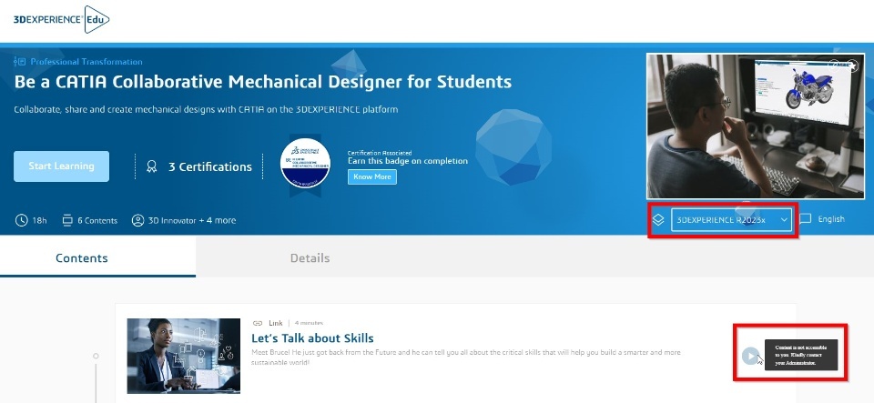 Hello everybody, I am working myself into CATIA by using the Learning Modules for "Explore the Mechanical Designer Role". But I noticed that the turorials are outdated. And that was, because I was using the "3DEXPERIENCE rR2021x" version of the Learning Modules. Switching per dropdown menu to the "3DEXPERIENCE R2023x" version results in unaccessibility of the learning modules - please see the screenshot. Can somebody please explain how I can access the R2023x learning modues?