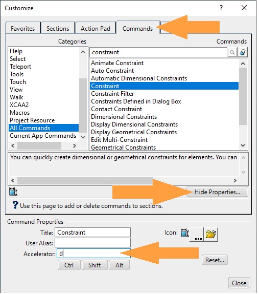- Click on "Customize", and then go to the "Commands" tab. Here you can see an overview of all the commands in the platform.