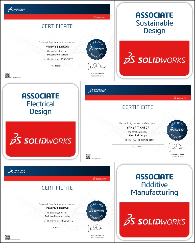 I'm now a Certified SolidWorks Associate in Mechanical Design, Sustainable Design, Electrical Design & Additive Manufacturing...