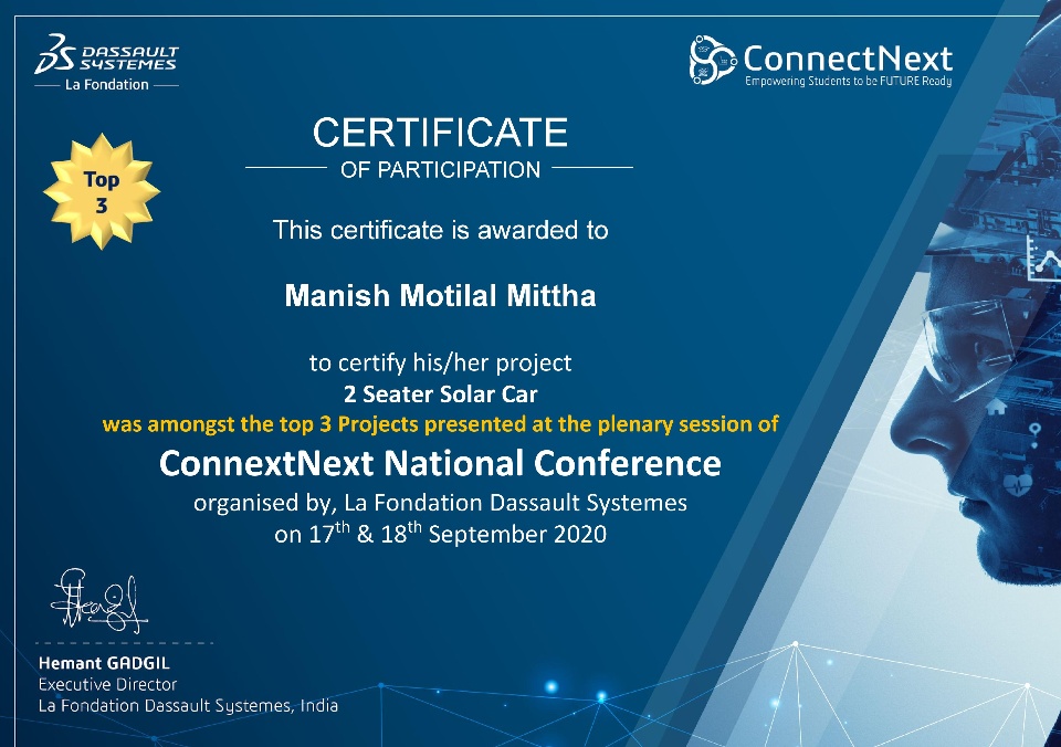 I am very Happy and Delighted to share with you all that our project Two-Seater Solar Vehicle "A Dream to Reality" is shortlisted in the top 3 projects out of 100 shortlisted projects by Dassault Systemes La Fondation in their ConnectNext Program.