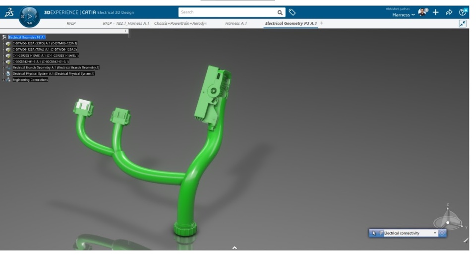 The complete harness is designed on 3D Experience using CATIA Electrical System Design, CATIA Electrical 3D Design, CATIA Electrical 3D Part Design, and CATIA Generative Electrical 3DDesign.