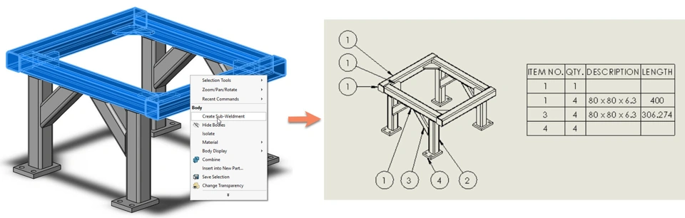 Generate cut list tables to add BOM-like tables for cut, welded structural shapes in your drawings.