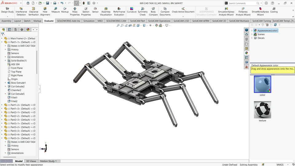 Excited to share the completion of Task 02 — modeling a unique Spider Bot using SOLIDWORKS, with emphasis on innovation, creativity, and manufacturability.