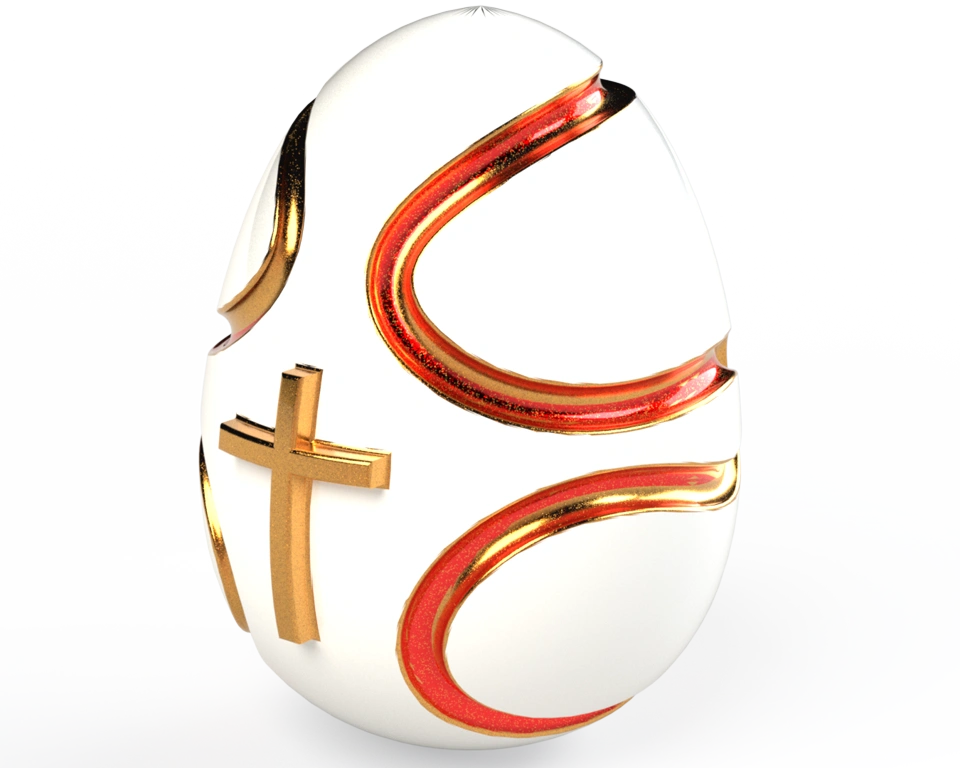 Once again, the egg — this time symbolizing the different phases of the Stations of the Cross, represented by their colors: gold which refers to the celebration of Easter; red symbol of the suffering experienced by Christ and white, which represents the light and victory of the Resurrection.