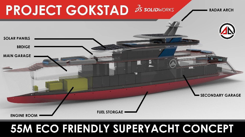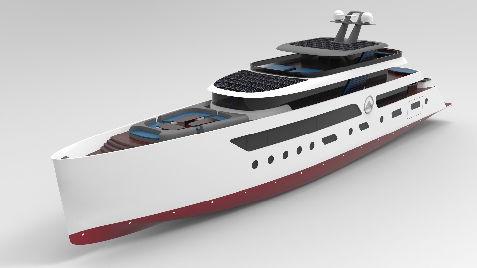 I have made this for Project of the year 2021 challenge by 3dexperience edu. It is fully done in Solidworks. Reducing carbon emission with sleek lines and providing best possible amount of usable space and layout was the main intention behind this project. In this project it is tried to make a best possible design which is conventional and Eco-friendly. It is a tri-deck yacht with tons of room available for indoor and outdoor entertainment. The massive waterline length gives the boat tremendous ability to save fuel. Speaking of ability, this yacht is equipped with 5 Generators. 2 of them are main generators and other are for standby or when in dock or anchor for electricity generator. Main generators generate up to 1000kW or 1340 hp which can push it at 20Knots maximum. This speed is massive compared to its size. One of its exceptional features is it can run in single engine alone or use both engine whenever necessary. This ability to choose only one engine or both results to one the most efficient propulsion package.