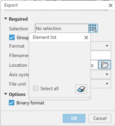 - Opening the model in 3D Printing and clicking Export > STL file… . This option only appears under the export menu when I open the model in 3D Printing, in Part Design all I can see is Knowledge Report. Clicking it opens the menu shown in the first image, in which it is impossible to select anything. If I select the 3D shape or the part in the tree on the left, a yellow box appears saying that the object cannot be exported.
