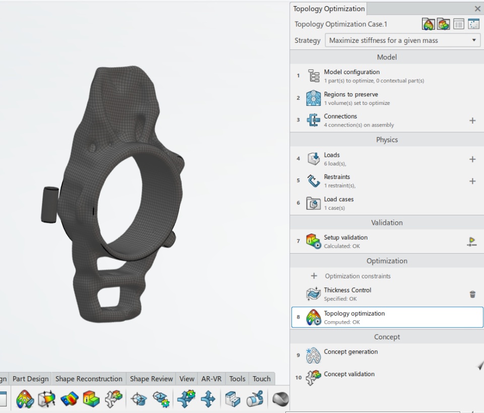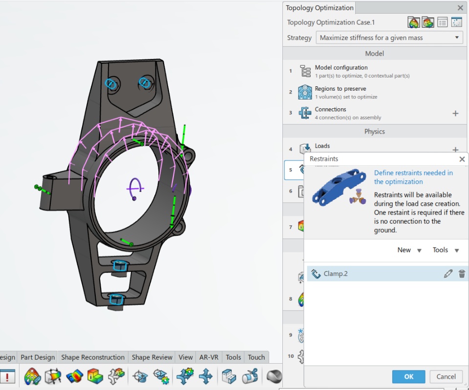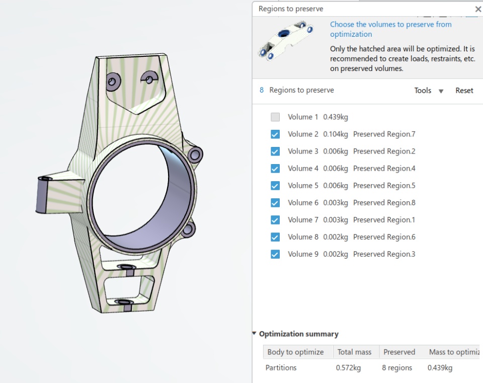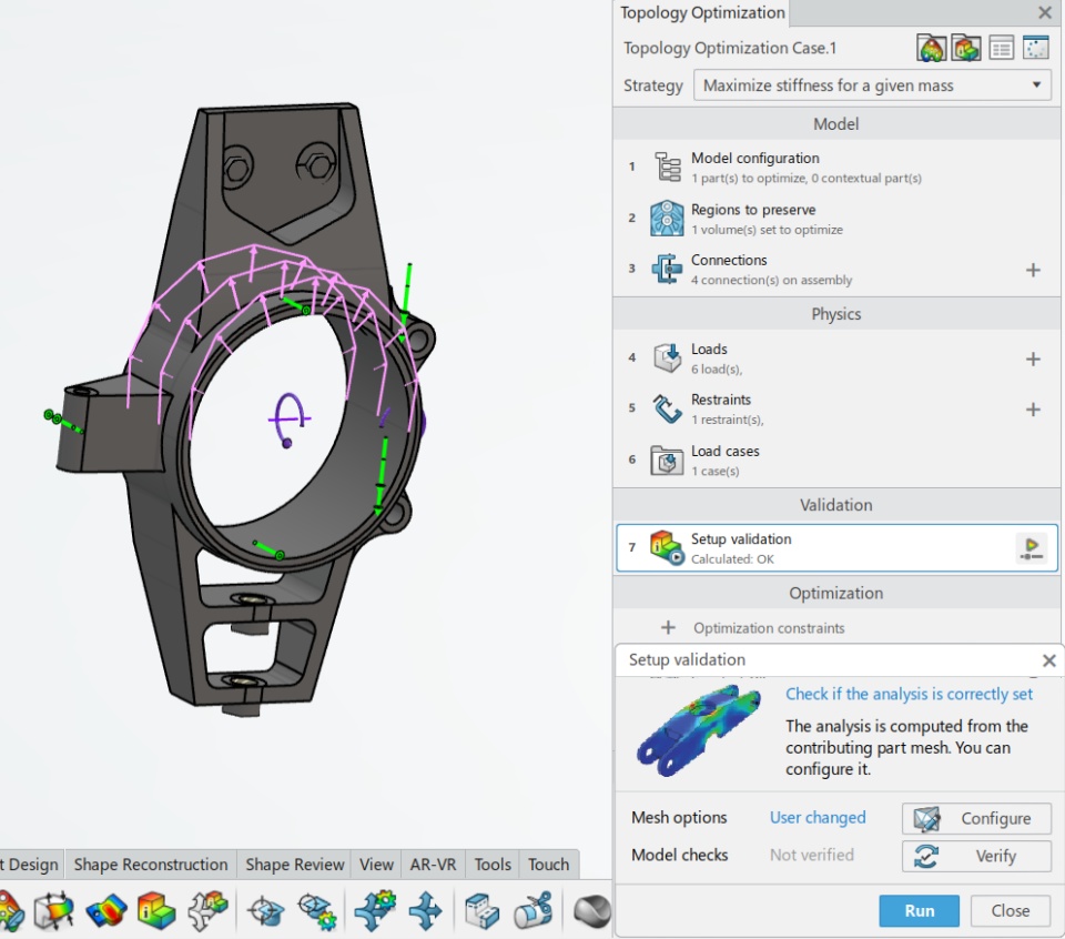 Configure the model 1. Create Partitions 2. Connections | After creating the design space, you need to set it up for further operations by creating partitions, defining functional regions, and applying materials. In addition, you can provide virtual connections to provide the links of the part to the assembly. Partitions are created where your part will be assembled with the main assembly using bolts or any other connection type, partitions allow for preserving the material at the connecting surface. (Please see the screenshot) Apply Connections such as bolted connection, sprint, etc, depending on your design. | |