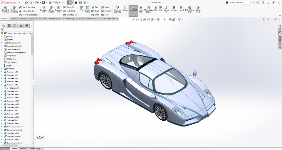 Hello everyone I did a Ferrari Enzo design using the blueprint technique in Solidworks. I put blueprint photos below in case anyone wants to do it. I've created rendered images using Keyshot and I hope you enjoy it.