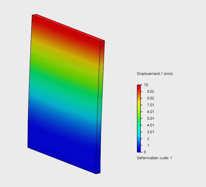 | Displacement:- This image illustrates the structural displacement of a baffle, showing it's fixed at the bottom (0mm displacement) and experiencing its maximum deflection of 10mm at the top edge, likely in response to fluid forces. |