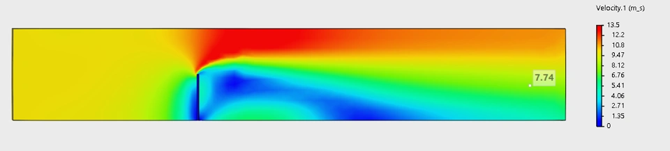 Velocity This image presents a contour plot illustrating the velocity distribution of air flowing over a flat, thin, rectangular obstacle, likely a flat plate or a slender wall, within a channel. As the uniform yellow flow (around 10 m/s) approaches from the left, it sharply encounters the obstacle, causing the air directly in front to decelerate significantly, indicated by the dark blue region signifying near-zero velocity where the flow effectively stagnates. |