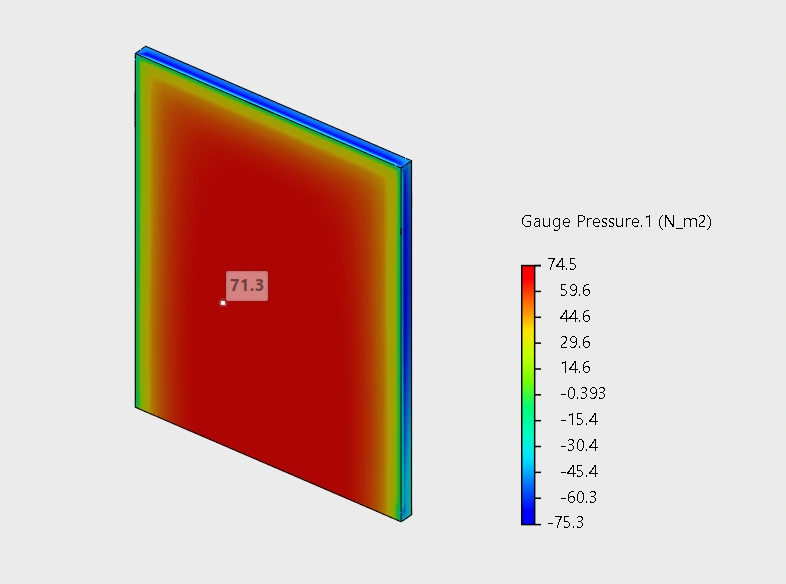 | Gauge Pressure This image shows how pressure is distributed over a Baffle plate. As air flows over the baffle, pressure is highest where it's directly obstructed, then rapidly diminishes and becomes negative along the leading and trailing edges. |