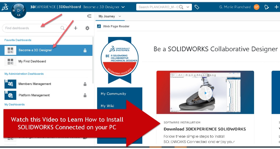 Watch the video on the "Become a 3D Designer" dashboard. SOLIDWORKS Connected app is 15 Gbytes - you got lots of great features - so let us help you during the installation process.