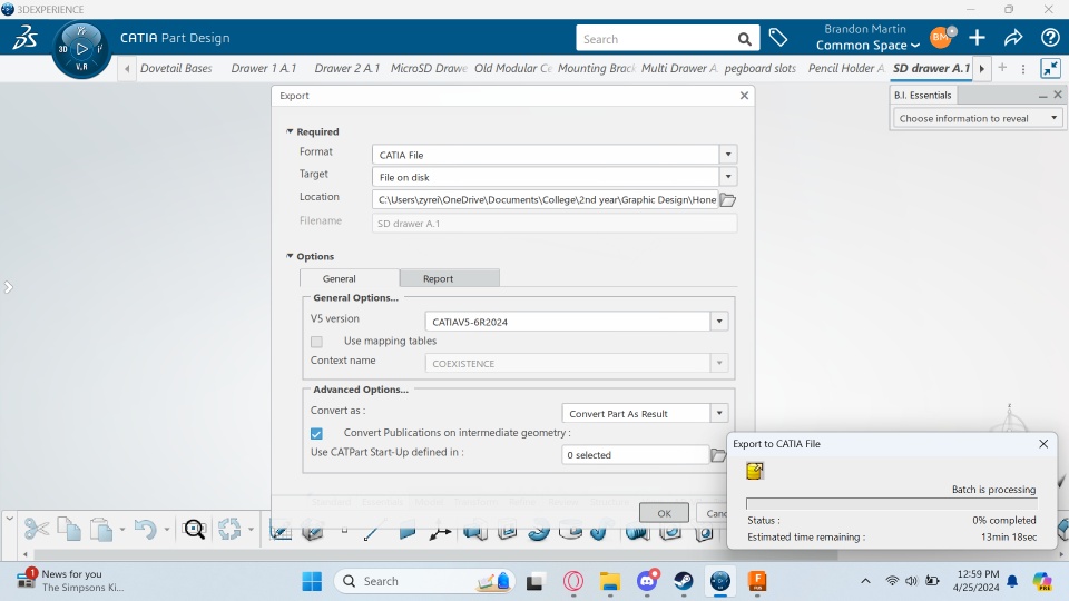 My instructor requires all my project submissions to be in cat files. However I cannot use catia v5 on my pc due to a conflict with the graphics card I have, so I purchased the student license for 3dexperience with my own money and have been trying to get it to be my solution for being able to do my coursework despite not being able to use catia v5 anytime other than in the classroom. I figured that since catia v5 and 3dexperience were made by the same company, that it would work fine, and it has all the export functions in it to theoretically work fine, but something is breaking and I have no idea why or where.