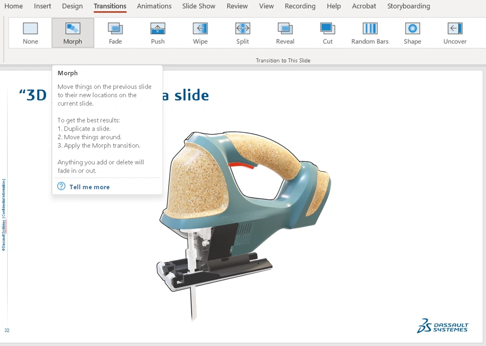 You may also pick a Morph Transition on the next slide so that the 3D model travels between slides.