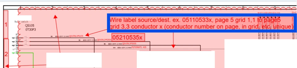 See attached screenshot: I want every wire label to include both origin and destination coordinates, e.g. page 5-grid 1,1 → page 6-grid 3,3. Equipotential formulas let me pull the origin page and grid, but I don’t see any variables for the destination end, so only half the tag is automatic.