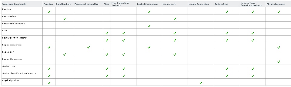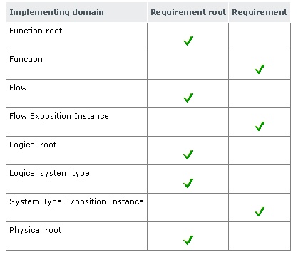 Implement links are used to connect objects from the four RFLP tree categories (Requirement, Functional, Logical, Physical).