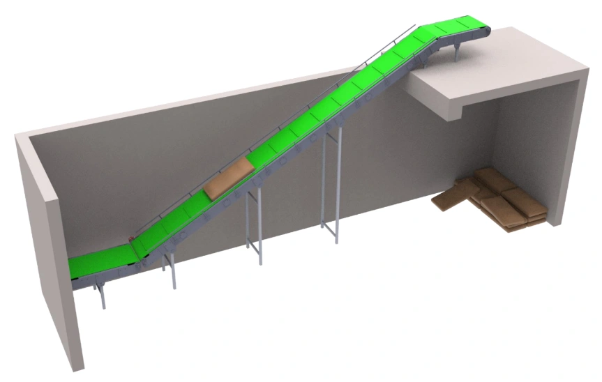 A inclined belt conveyor designed for transfer material between different height levels in the factory. This system optimizes production by smoothly transporting raw material between production floor and storage area.