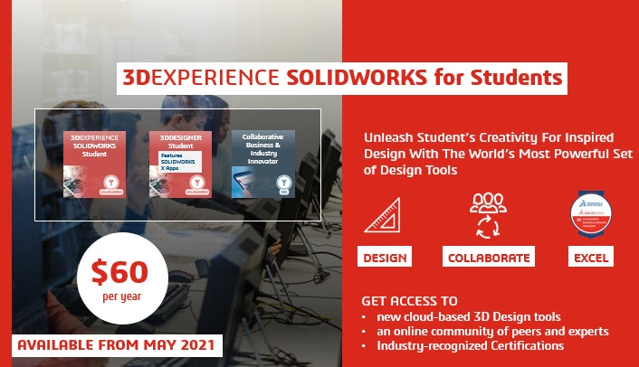 Attention Students! We know innovation in all industries depends on our ability to equip the workforce of the future with the right knowledge and know-how. Skills in cloud transformation is the top priority for corporations of any size. Introducing 3DEXPERIENCE SOLIDWORKS for Students available May 2021 via direct online purchase. GET ACCESS TO: new cloud-based 3D Design tools; an online community of peers and experts AND Industry-recognized Certifications. Students can sign-up now to be first in line for May 2021: www.solidworks.com/3DXSWforStudents