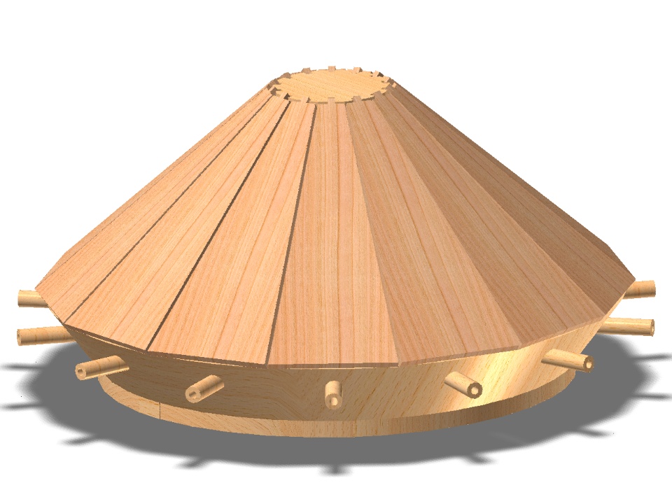 The design features a metal reinforced wooden conical cover, reminiscent of a turtle shell, with slanting angles designed to deflect enemy fire. An array of 16 light cannons would protrude around the perimeter and the vehicle would be propelled by a crank, to be operated by four men.