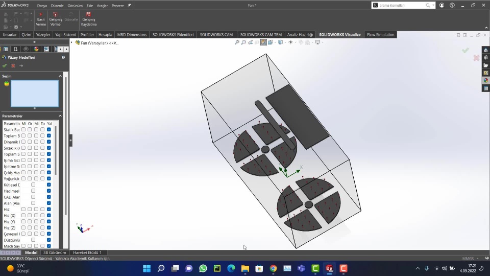 I can't analyze professionally, it's been a few days since I found out. Here, the pressure, velocity and temperature values were sufficient for me. and I did it to see the inner flow.SOLIDWORKS Visualize video