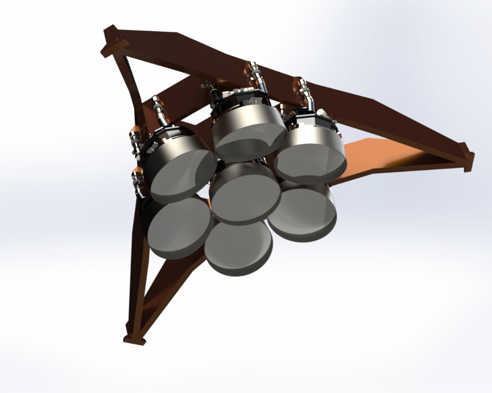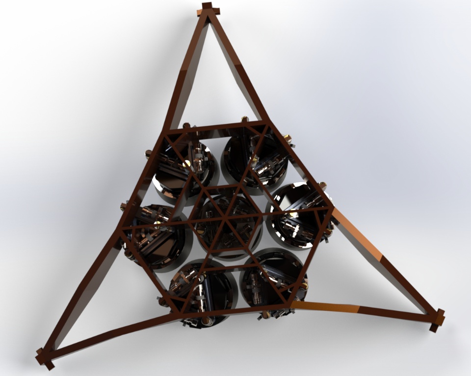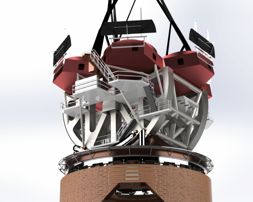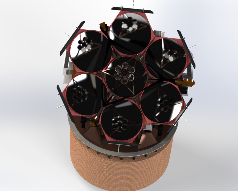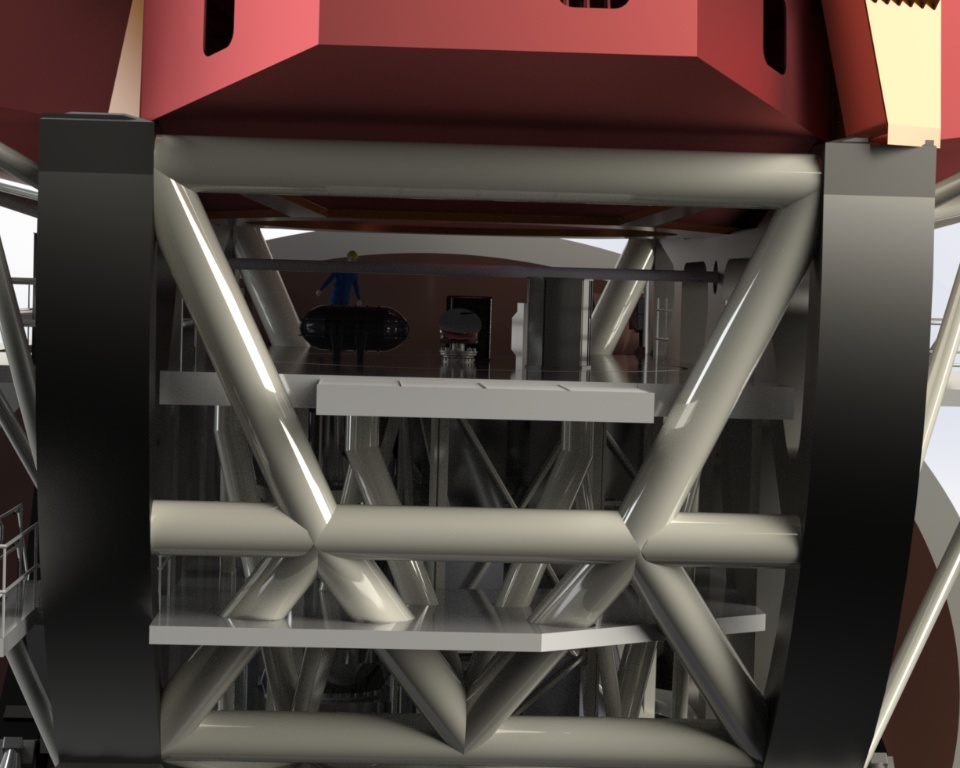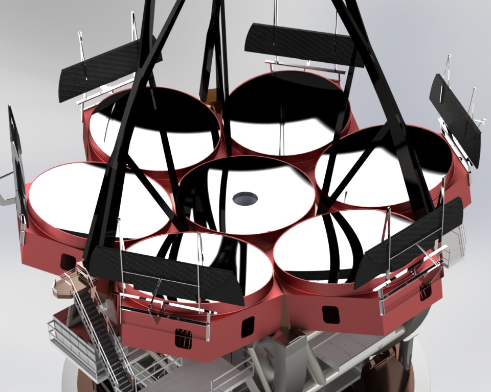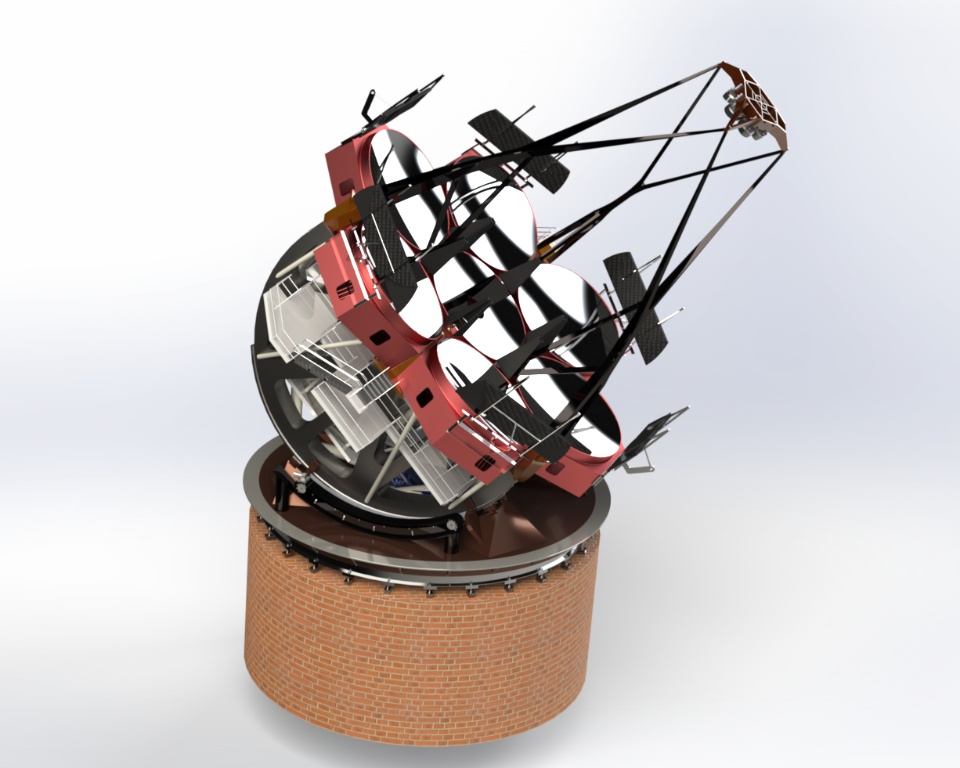The main truss is best described as a braced structural hexapod, which stiffly defines all six degrees of freedom for the top end assembly. The braced hexapod truss outperforms other designs due to its low wind area, excellent modal performance, minimal light blockage, reduced diffraction, and low thermal mass.