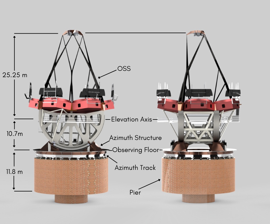 The C-rings along with the azimuth track and azimuth structure provide the necessary 360-degree field of view to the telescope. All the assemblies and components above the Azimuth structure are designed with the motion of the telescope in mind, supports are provided as see fit.