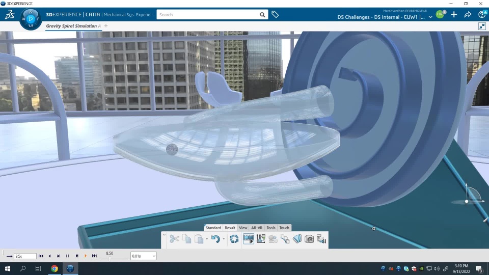 We have Used Part Design and Generative Shape Design Apps to design the parts, Assembly Design to assemble the parts while creating a joint that enables the Spiral to rotate and lift the Ball. We have defined "Contact" between the Marble and the other parts, so they behave like in the real world, and do not intrude into each other's volume. And finally, with Mechanical Systems Design and Mechanical Systems Experience Apps, we have added and varied Gravity Excitation as per our wish (and a velocity excitation to keep the spiral rotating).