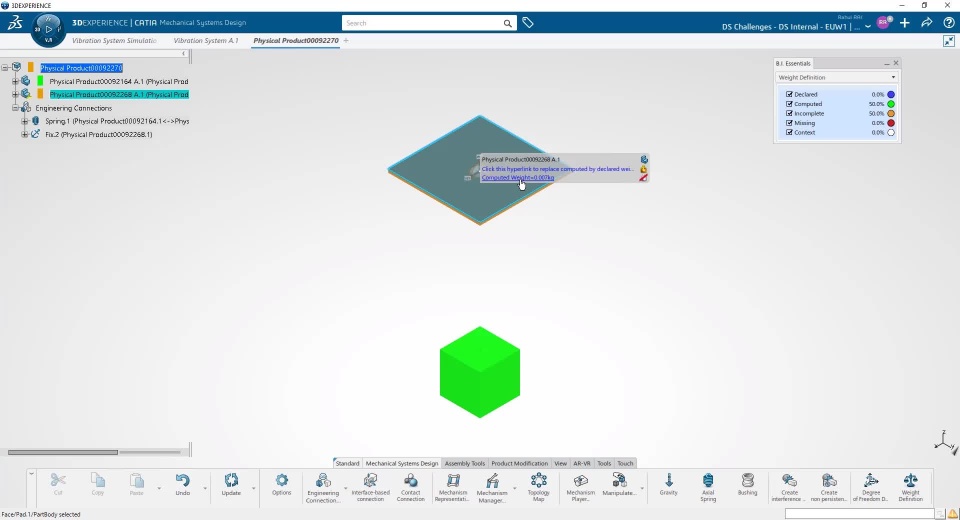 💪Powers of Mechanical System Design(MSD) ✅ Contact (⭐ friction, collision, etc.) ✅ Gravity ⭐ ✅ Axial Spring ✅ Bushing 💪Powers of Mechanical System Experience(MSE) ✅ Position Excitation ✅ Velocity Excitation ✅ Force Excitation ✅ Torque Excitation ✅ Sequence of Excitation ✅ Probes (⭐ position, speed, acceleration, joint force, etc.) ✅ Plots ✅ Traces Recommended courses: Practice CATIA Mechanical Systems Design Practice CATIA Mechanical Systems Experience