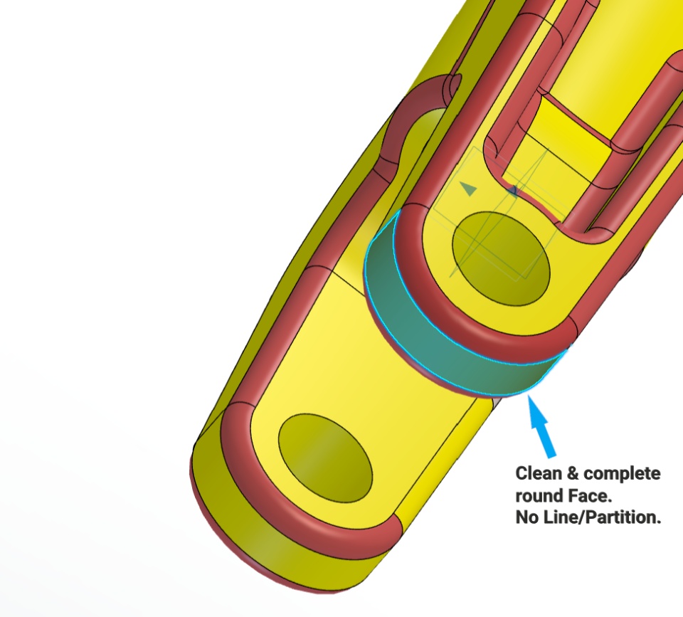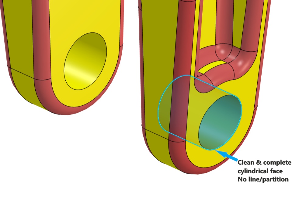 A feature like "Flip Side to Cut" makes 2 faces in one hole (partitions are created instead of one clean cylindrical face) in Xdesign. The solution to that is: