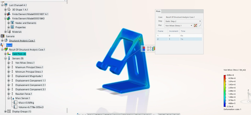 Maximum Von mises stress is too far from Yeild strength to ABS , so the part can handle 1 kg tablet phone without fail .