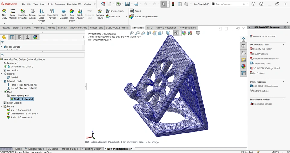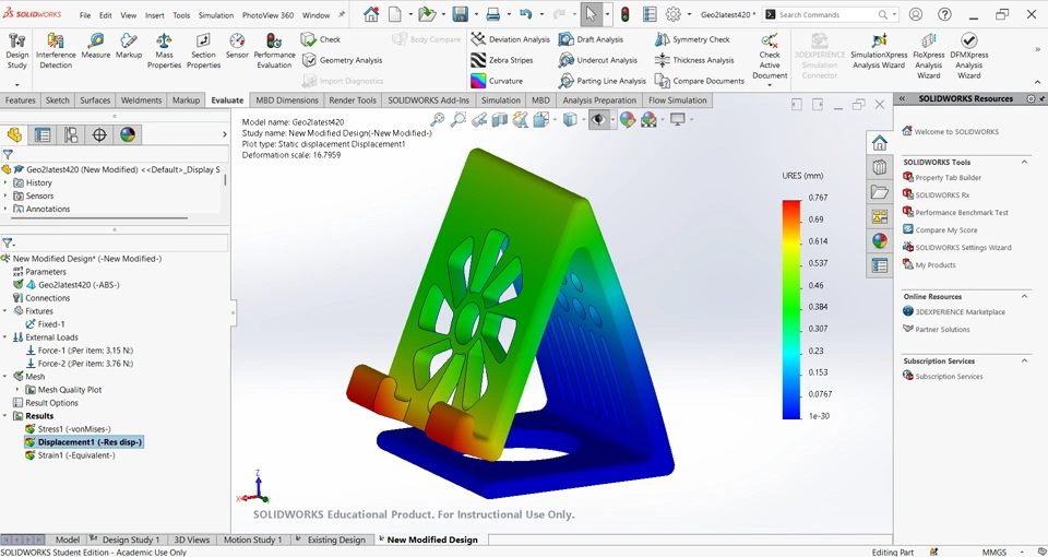 The final design achieves the best balance between stability, weight efficiency, and ergonomic usability. With parametric constraints, I was able to run 1298 design iterations to optimize the structure. The design stays within safe stress and strain limits while using 34.27% less material than the existing Design. Its simple yet functional form is validated through simulations, and FEA-driven optimization enhances structural performance while reducing material waste. This approach ensures a manufacturable design backed by scientific validation.
