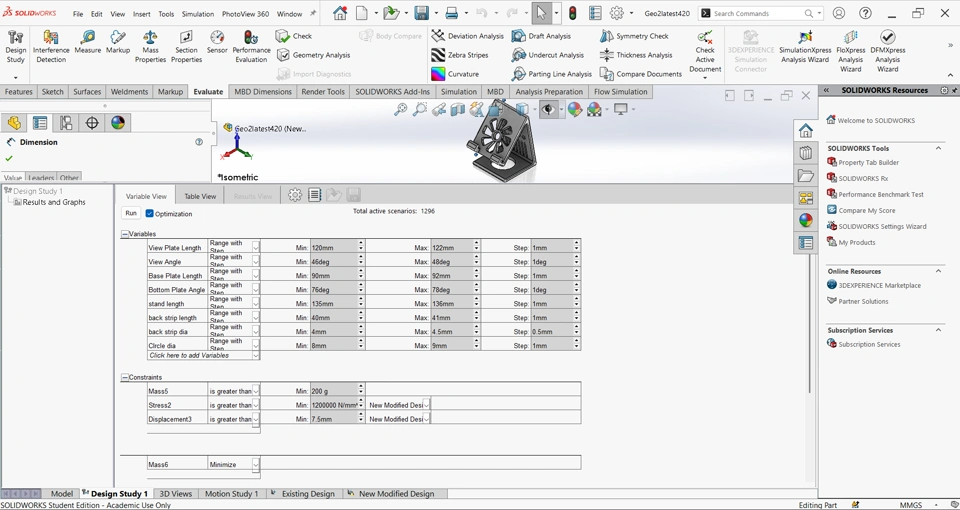 A total 1298 Scenerios where created for getting optimum design that has minimum mass, stress and overall displacement taking considering various parametric dimension.