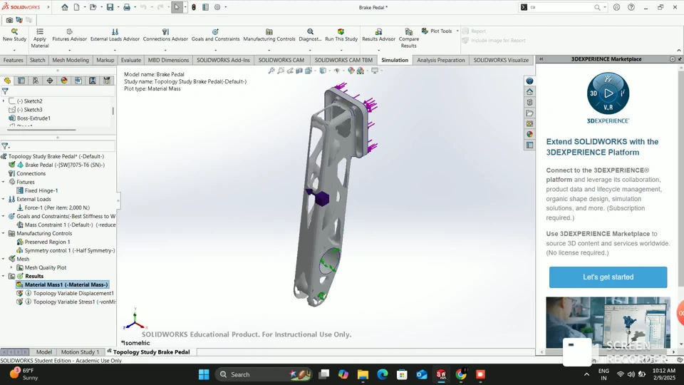 Using SOLIDWORKS Topology Study, we optimized the pedal design by removing non-load-bearing material while ensuring structural stiffness. The goal was to achieve the best stiffness-to-weight ratio while reducing unnecessary mass.