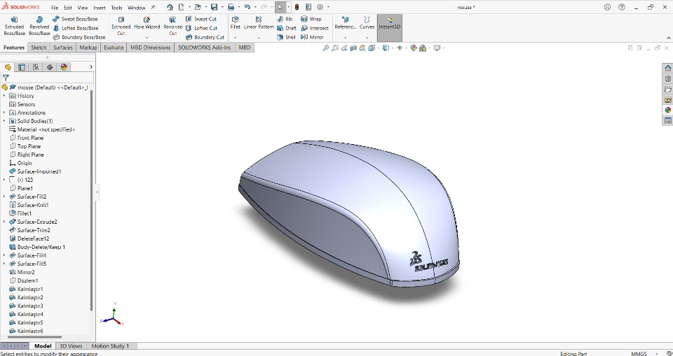 This is my mouse design which I designed accordance to the training videos in MySolidWorks for CSWP-SU exam.