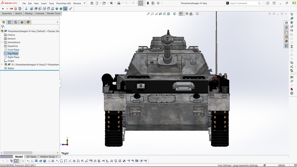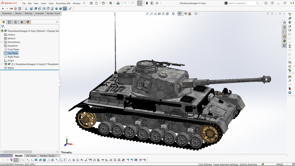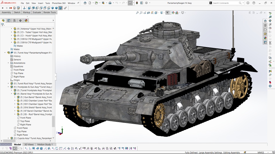 The Panzerkampfwagen IV, commonly known as the "Panzer IV," was a German medium tank developed in the late 1930s and used extensively during the Second World War. My keen interest in SolidWorks and CATIA made me design the Panzer in both programs. I have rendered the model in my all-time favorite, SOLIDWORKS Visualize 2021. This is a huge assembly that wouldn't have been possible without the FeatureManager Design Tree and Renaming features in the software. I have also tried to render the battalion of Panzers (which led to an error when there were more than 400+ Panzers). Finally, I have managed to render them too.