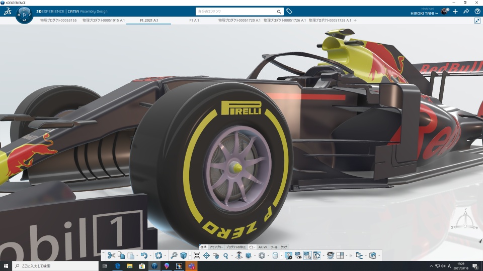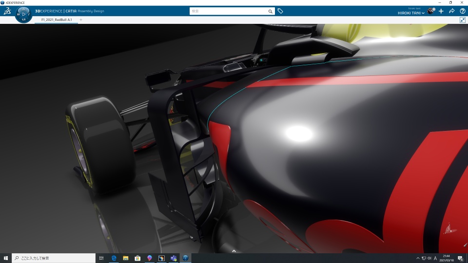Thank you to everyone who likes 3D design. This is Hiroki Tani from Aso College of Architecture and Design! This time, I modeled a Formula 1 car for Project of the Year 2021. This car is based on the 2021 F1 regulations, and was created to improve my 3D CAD skills and to perform fluid analysis as an output after modeling. Small aero parts, big tires, moving rear wing (DRS), detailed front wing, steering wheel with lots of buttons. Faithfully reproduced. The livery is Red Bull Racing, which is also popular in Japan. I saw F1 for the first time at the Suzuka Circuit when I was three years old. I love F1. Enjoy my Formula 1 car! Overall length: 5500mm Overall height: 948mm Overall width: 2000mm Wheelbase: 3600mm We then ran VR simulations to look for problems that we could not find on the monitor screen. There were problems with the way the steering wheel and mirrors looked, and we changed those. We provided a wonderful experience for high school students to do VR at open campus and other events. SIMULIA was used for the fluid analysis simulation, and DRS (Drag Reduction System) was turned on and off to obtain appropriate simulation results. DRS Closed 3.5e+3 (N_m2) DRS Open 1.5e+3 (N_m2) In the first simulation, the floor part did not work, so we had to rebuild it. In the second test, we applied a wind speed of 300 km/h. On the floor and on the top, we were able to measure 380 km/h. We were able to draw the air flow, and the result was a success. I am looking forward to the opinions and evaluations of many people. Thank you for your time.