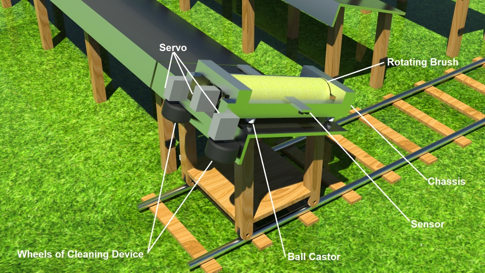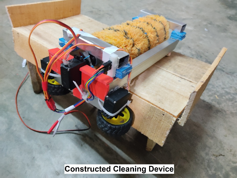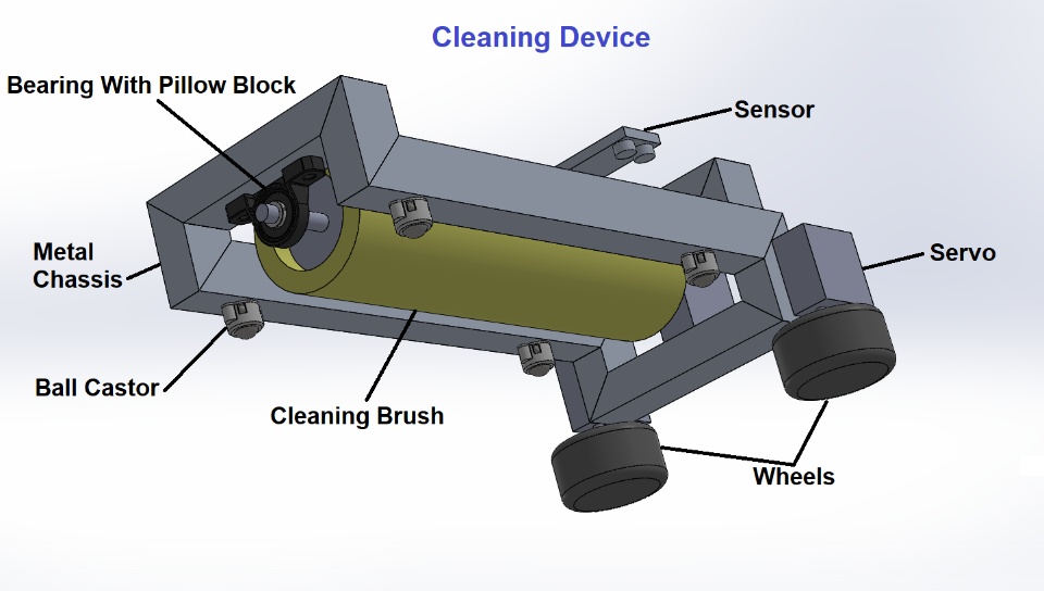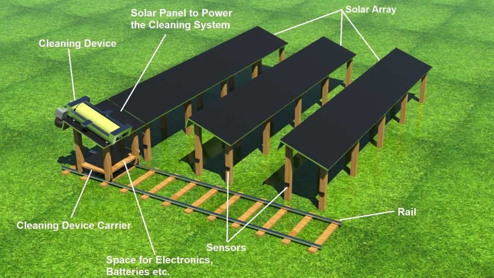 The usage of renewable energy is increasing rapidly worldwide and solar energy is at the top of them. One of the main challenges of a solar farm is to keep the surface of the solar arrays clean so that the maximum amount of solar energy can enter the solar cells. Currently, different technologies are being used to clean solar panels at larger solar plants which have many limitations like required manual labor or required cleaning device for every solar row. In this project, a solar-powered automated cleaning system is designed that not only can clean a single row of an array but can transfer itself to another row for cleaning purposes. The system is composed of 2 main parts: the cleaning device itself and a transporting mechanism for the cleaning device to move the cleaning device between the rows. The cleaning device with the help of a rotating brush can clean a single row of an array and the transporting mechanism, a trolly-like structure, can transfer the device to the next row of the array using rails. This feature will minimize the need for manual transfer of the device between rows or installing a device in every row, thus the designed system will make the process fast, uninterrupted, and fully automated. The carrier has a solar panel installed to power the cleaning system. Furthermore, this system will open the possibilities for many customizations like switching between wet and dry cleaning of the arrays.