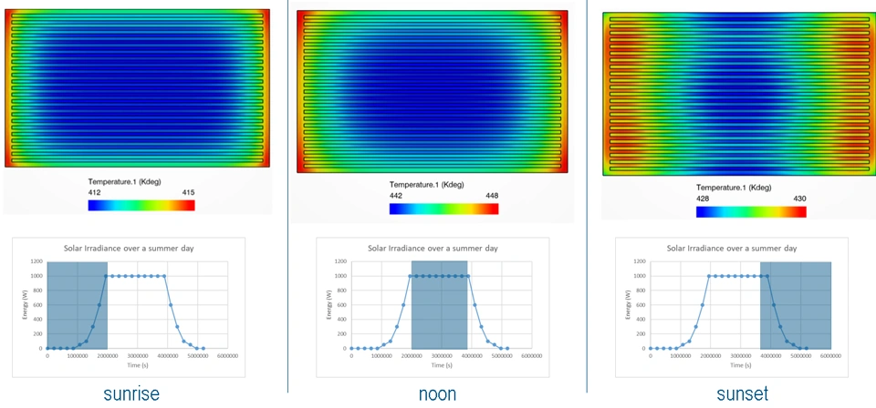 It can be observed that the temperatures exceed the optimal temperature limit i.e. 330 K when subjected to time variable heat flux. Thus optimizing the shape and geometry of the heat sink is quintessential for the optimal cooling of the Solar panel, thus ensuring highest efficiency