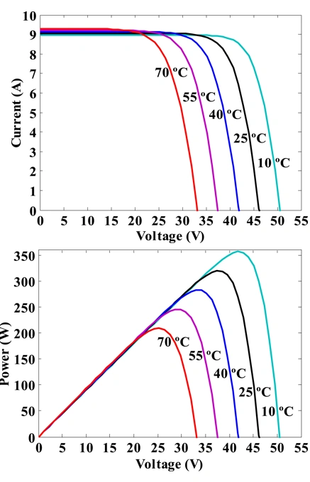 The temperature demonstrates a significant effect on the output performance curves of PV solar modules when irradiance intensity is kept constant. A minor variation is observed w.r.t 1000 W/m2 when the temperature varies from 10 °C to 70 °C. The voltage shows an increasing trend in I–V performance curve when the atmospheric temperature reduces. Also, the solar cell generates more power, when the atmospheric temperature reduces. Thus solar cell shows an inverse relationship with temperature.