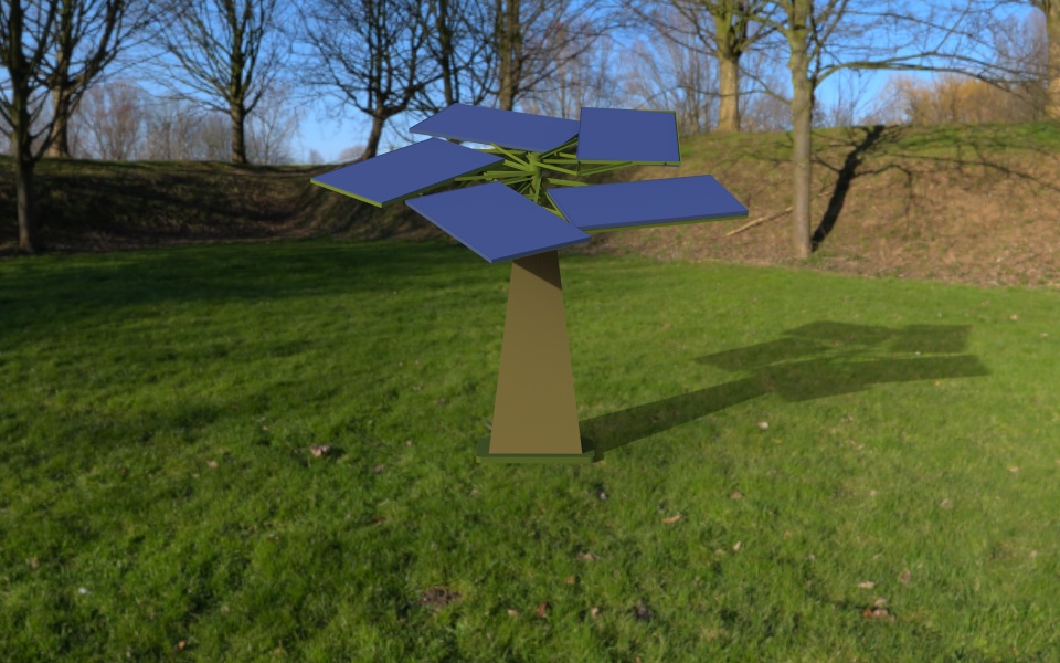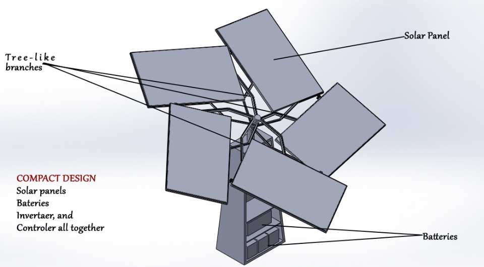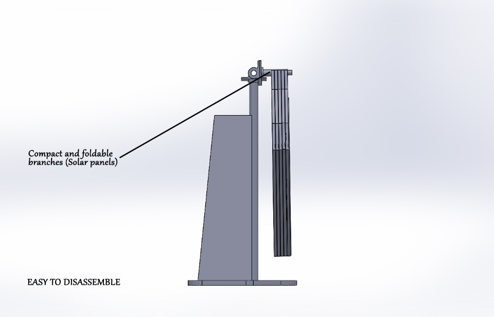 Solar Generator is a compact ecofriendly and sustainable solution that generates and stores electricity. It was designed to fit into the natural environment and looks like a tree with branches. It possesses solar panels, batteries, a controller and an inverter, which enable it convert and transmit solar energy. It is of aesthetic value and can take up to 5 solar panels. Multiple of the generator can be planted in grasslands to meet the power requirement
