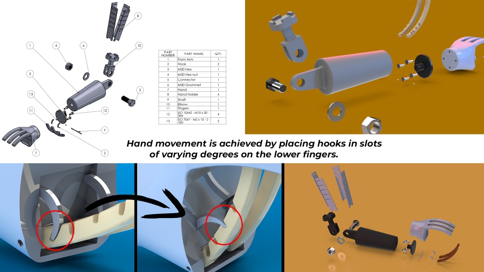 Hello, First of all, I thought about different mechanisms while making this design and I decided to make this design. In my design, I wanted a notch on the lower fingers of the prosthetic hand and prepared a suitable mechanism. The working principle of the mechanism is in the form of compression. The middle protrusion allows for varying degrees of movement of the lower fingers into the holes. I made a strong design that is sweatproof, comfortable, and easy to install. I used m30 type screws for bolts, nuts, washers, and m2 screws connecting the lower fingers to the upper fingers.