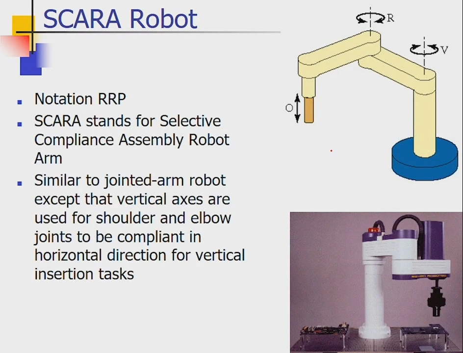 SCARAT stands for Compliance Assembly Robot Arm. SCARA Robots are similar to jointed-arm robots except that vertical axes are used for shoulder and elbow joints to be compliant in the horizontal direction for vertical insertion tasks.